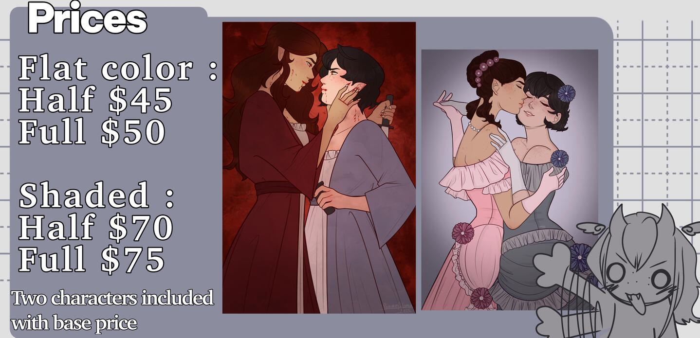 ► Additional fees may be added for backgrounds, last-minute changes, numerous sketch changes, super detailed nsfw, foreign currency conversion (I work in USD), lots of blood, and complex designs. The amount is up to my discretion.